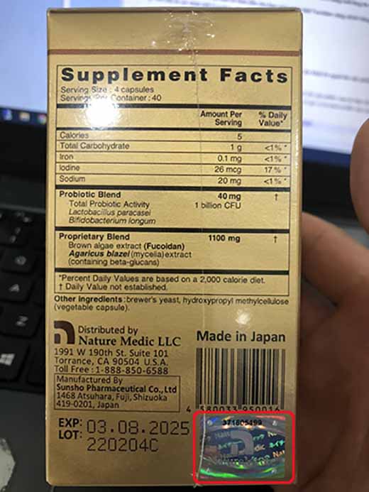 Mỗi sản phẩm nhập khẩu chính hãng đều được dán nhãn phụ của nhà nhập khẩu, quý khách hàng có thể phân biệt hàng xách tay, hàng nhái hay hàng chính hãng qua nhãn phụ. Công ty TNHH fucoidan Nhật Bản là đơn vị nhập khẩu, nên khi mua hàng quý khách phải mua đúng sản phẩm có dán nhãn phụ của công ty Fucoidan Nhật Bản