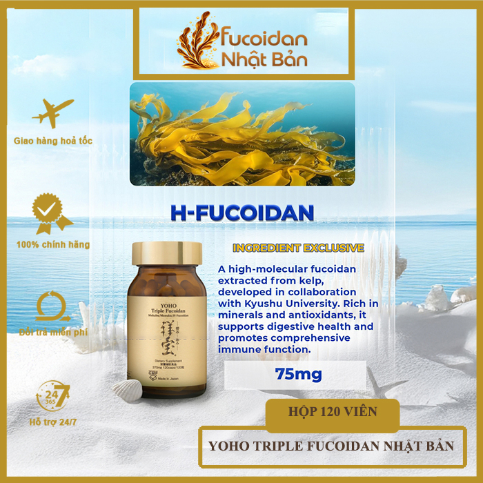 - H-Fucoidan là loại fucoidan phân tử cao đầu tiên được chiết xuất từ tảo bẹ, một loại tảo nổi tiếng với khả năng chống viêm tự nhiên. Tảo bẹ này sinh trưởng trong môi trường khắc nghiệt, lạnh giá, nên chứa hàm lượng cao khoáng chất và chất chống oxy hóa, giúp hỗ trợ sức khỏe hệ tiêu hóa và tăng cường hệ miễn dịch toàn diện.