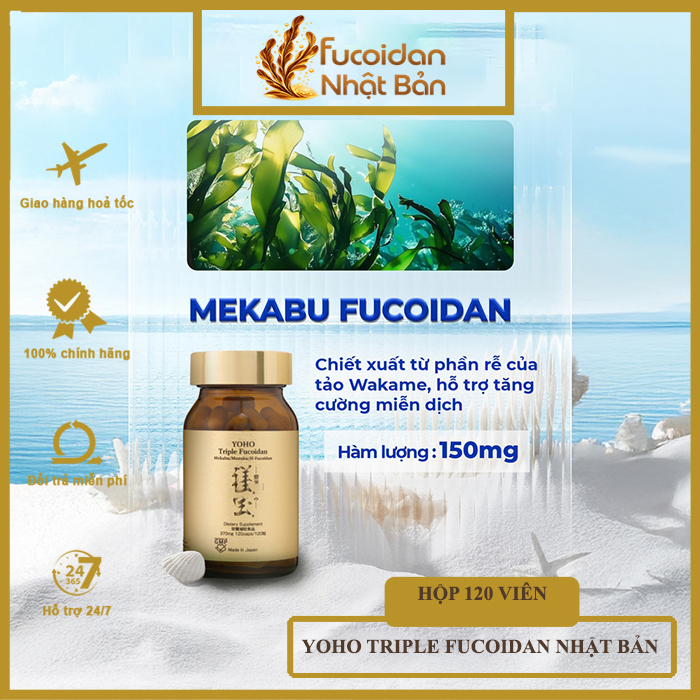 – Hộp Yoho Triple Fucoidan chứa 120 viên, mỗi viên chứa 300mg fucoidan