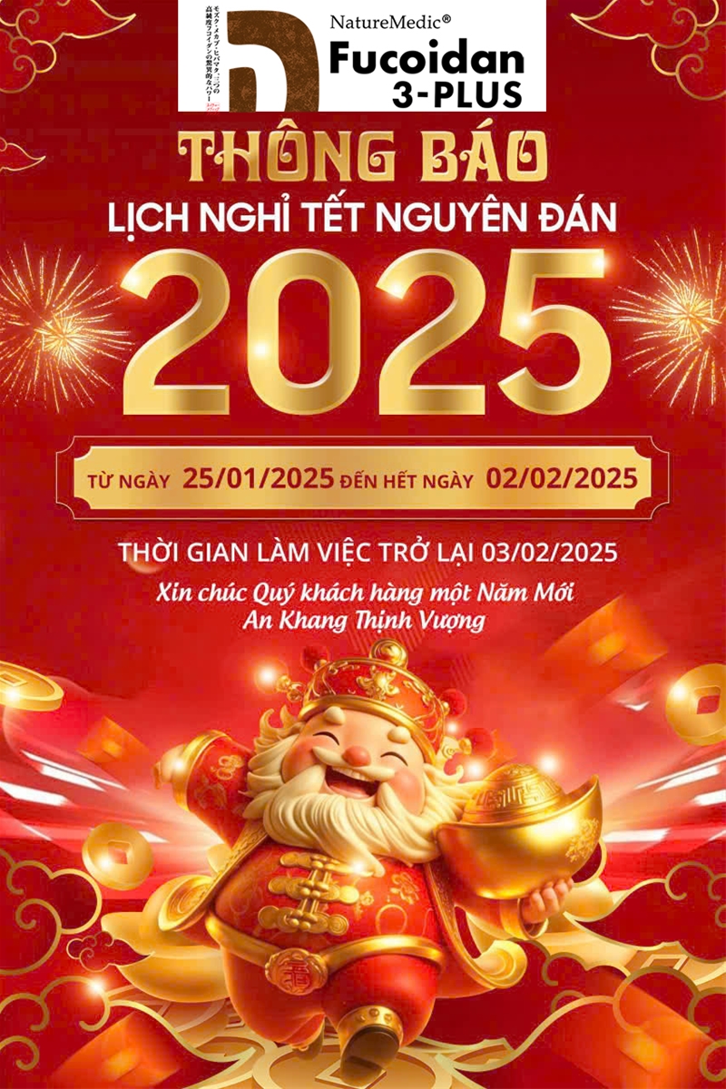 Văn Phòng FUCOIDAN 3-PLUS NHẬT BẢN trân trọng thông báo tới toàn thể Quý Khách hàng lịch nghỉ TẾT NGUYÊN ĐÁN ẤT TỴ 2025 và chương trình khuyến mại đầu xuân năm mới cụ thể như sau