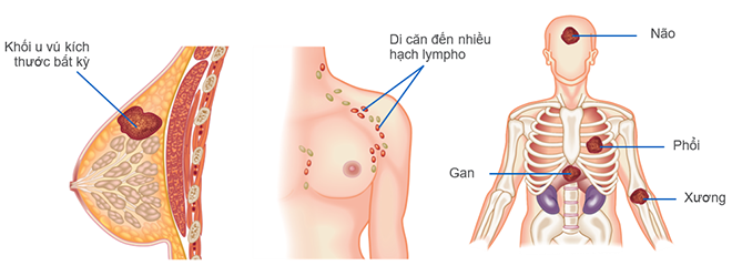 Ung thư vú di căn: khi các tế bào ung thư đã di căn đến xương, gan, não, phổi hoặc các bộ phận khác của cơ thể, tạo thành những khối u thứ phát ở đây, gọi là di căn xa. Điều trị toàn thân là biện pháp điều trị chính.
